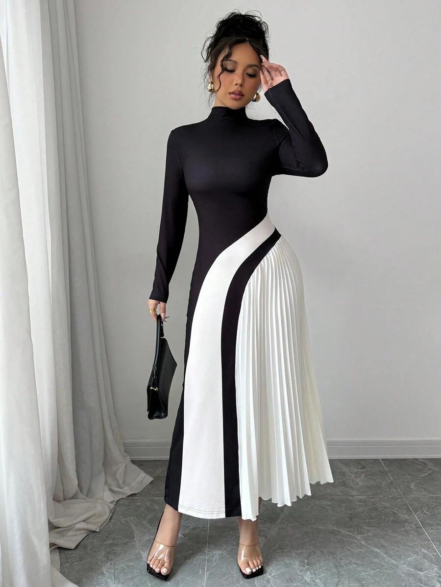 Rochie Lunga Miriam Negru cu Alb Plisata