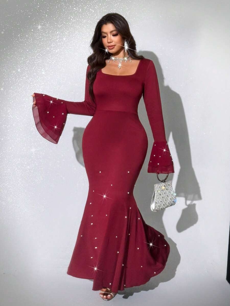 Rochie Lunga Oriana Grena cu Perle – Marimi Mari