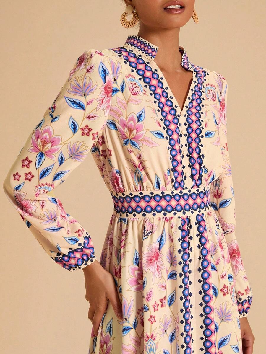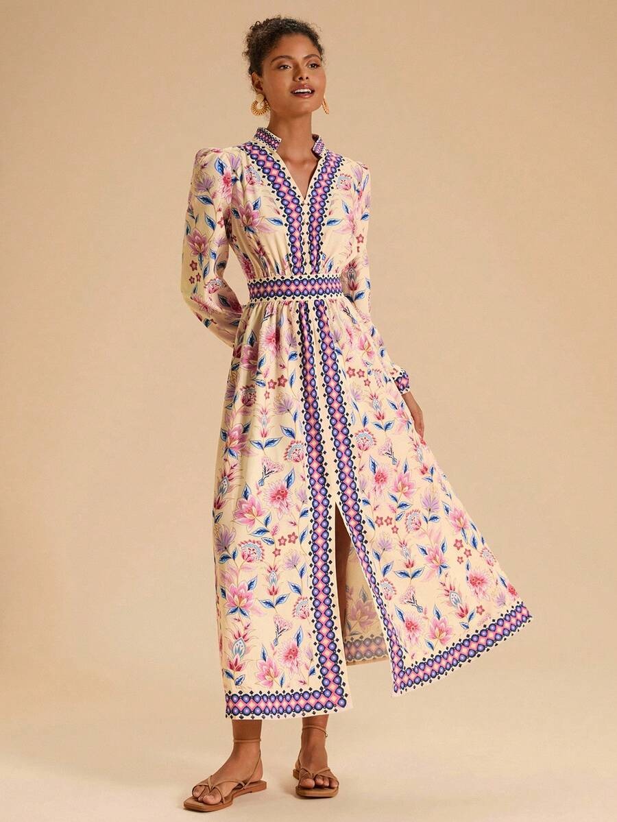 Rochie Lunga Sarah Crem cu Print Floral Roz