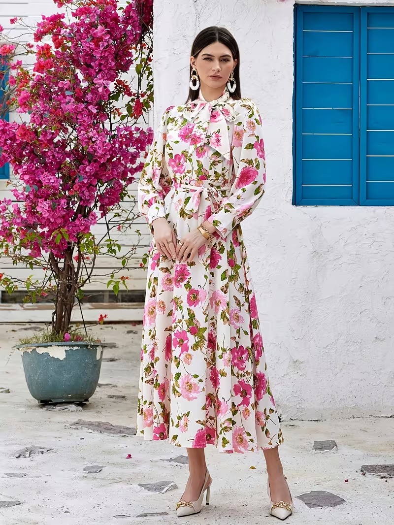 Rochie Lunga Simina Alba cu Print Floral Roz