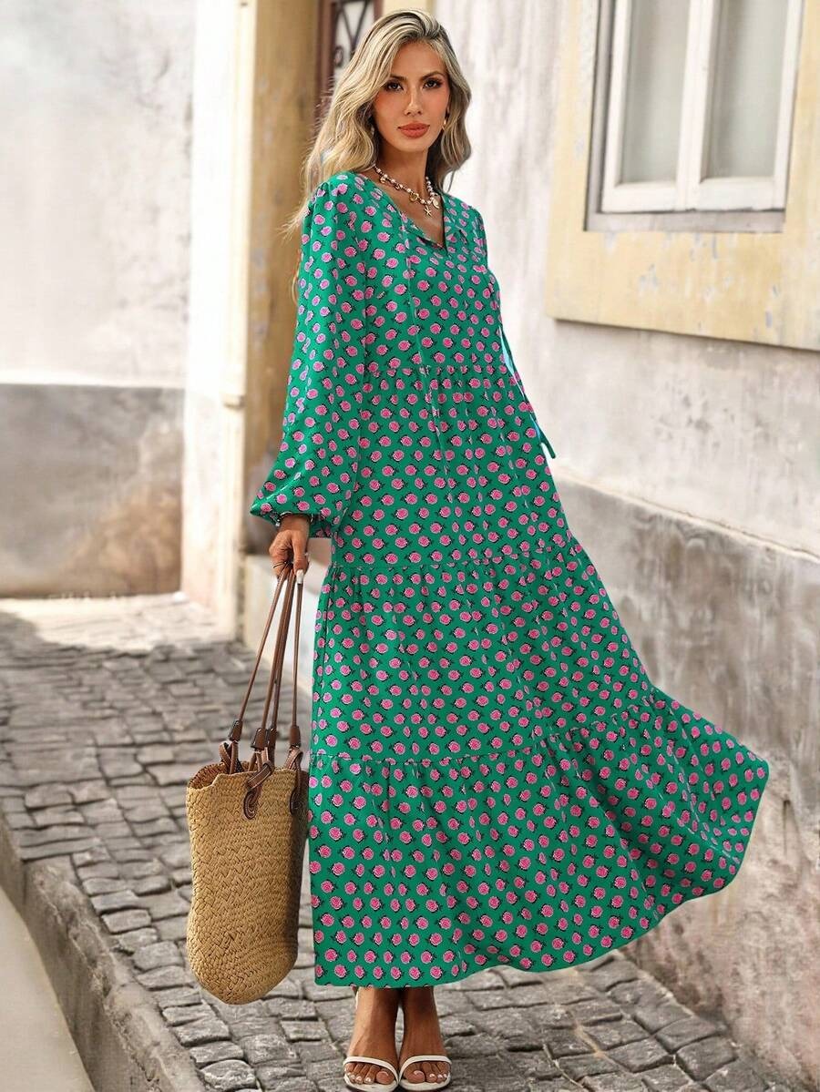 Rochie Lunga Simina Verde cu Print Floral Roz