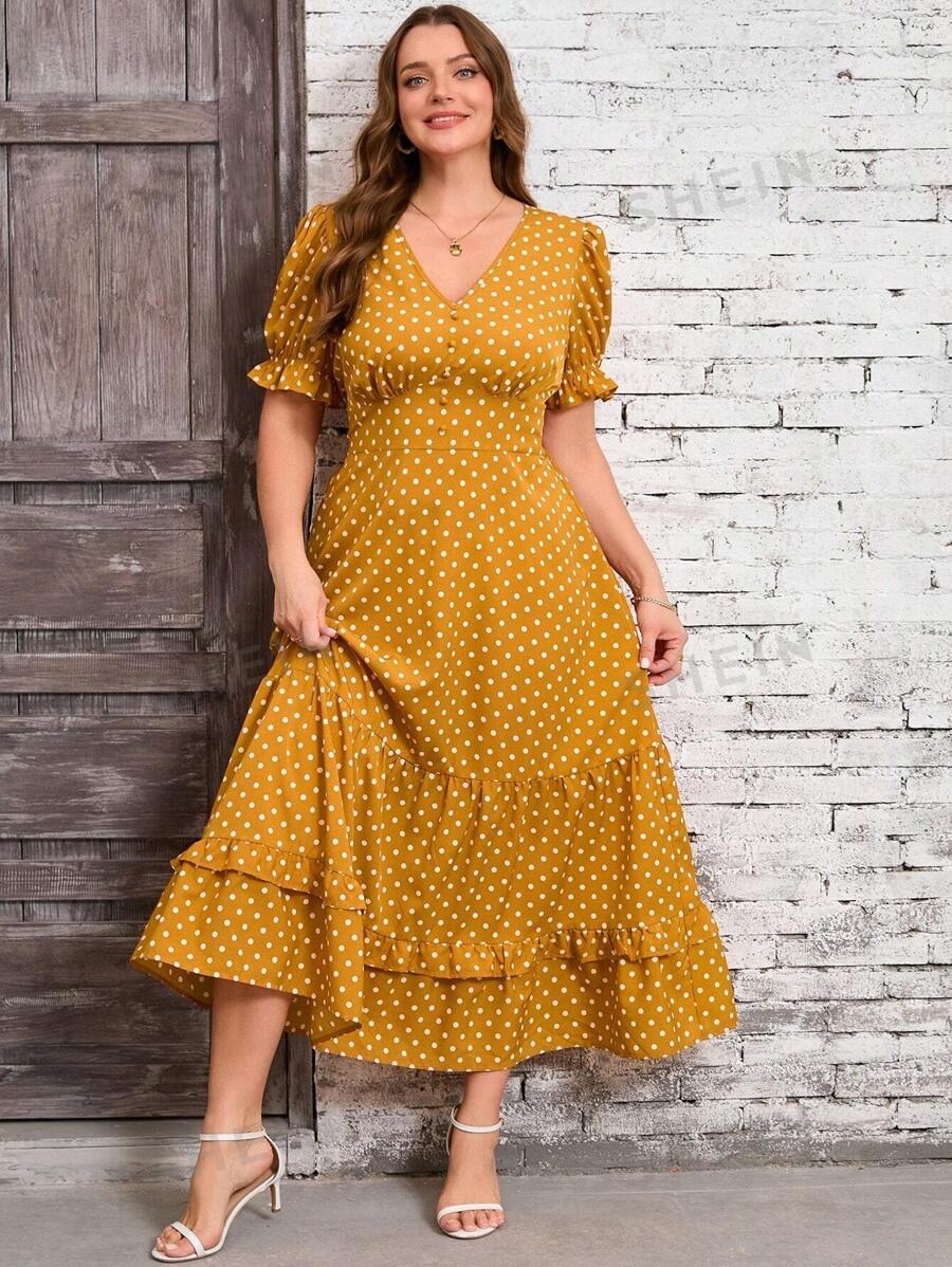 Rochie Lunga Tania Galbena cu Buline Albe – Marimi Mari