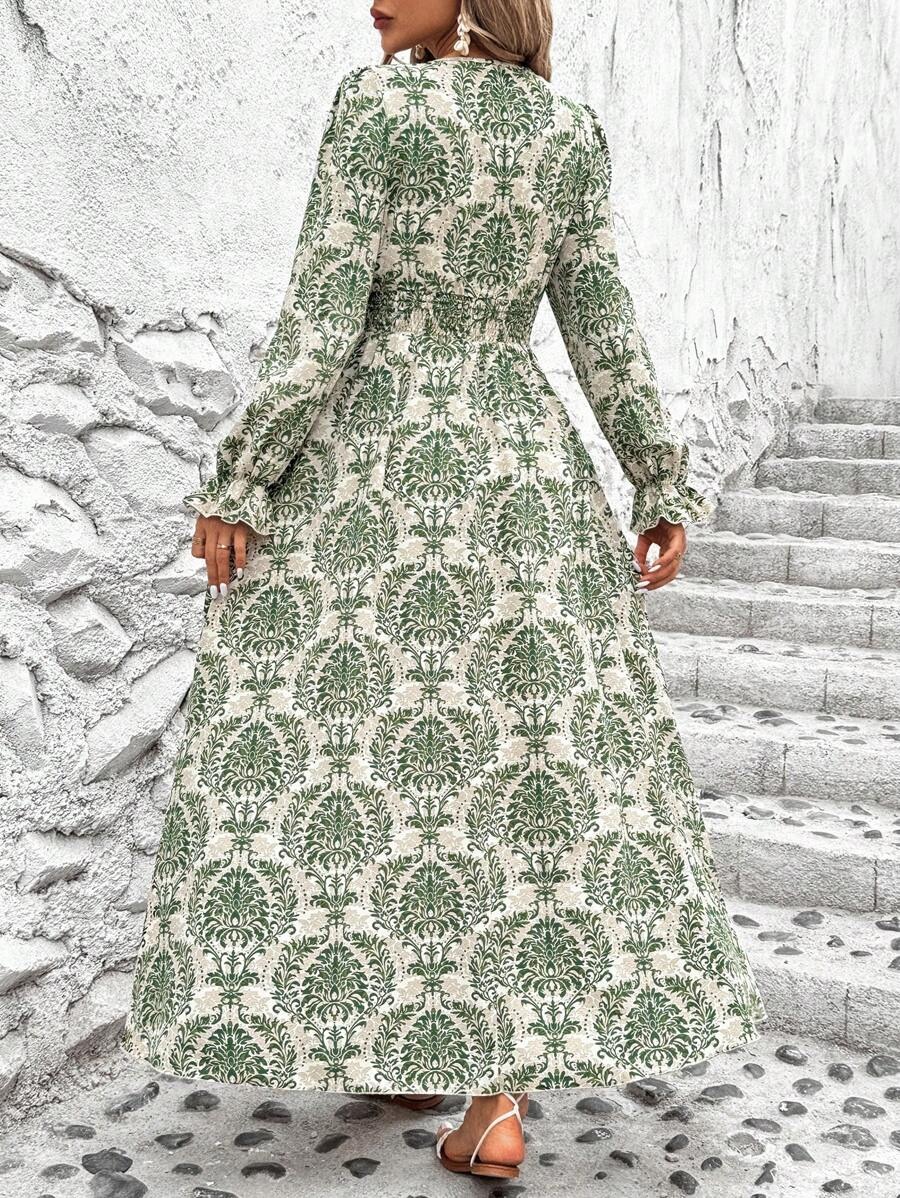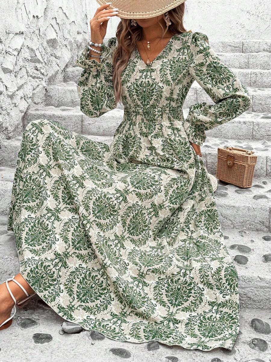 Rochie Lunga Tosia Bej cu Print Verde