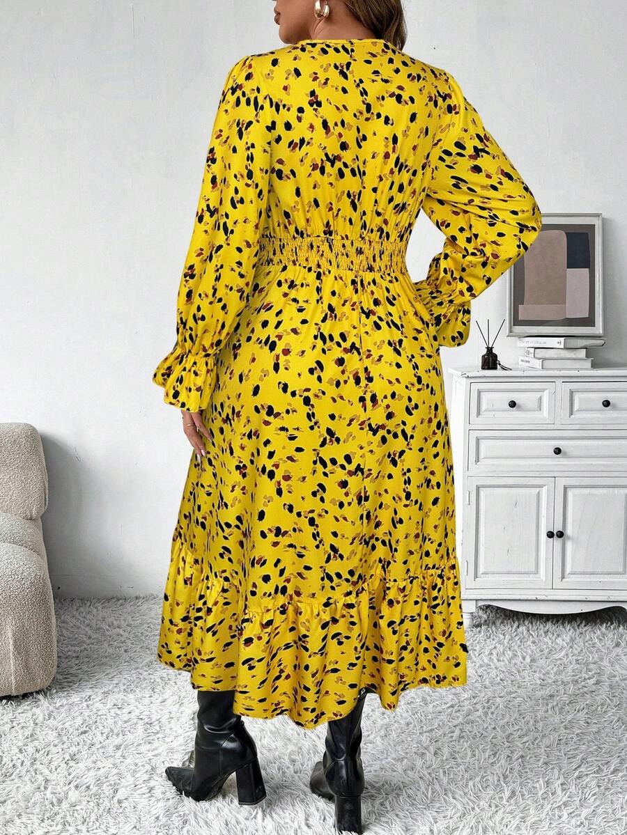 Rochie Midi Aletha Galbena cu Print Negru – Marimi Mari