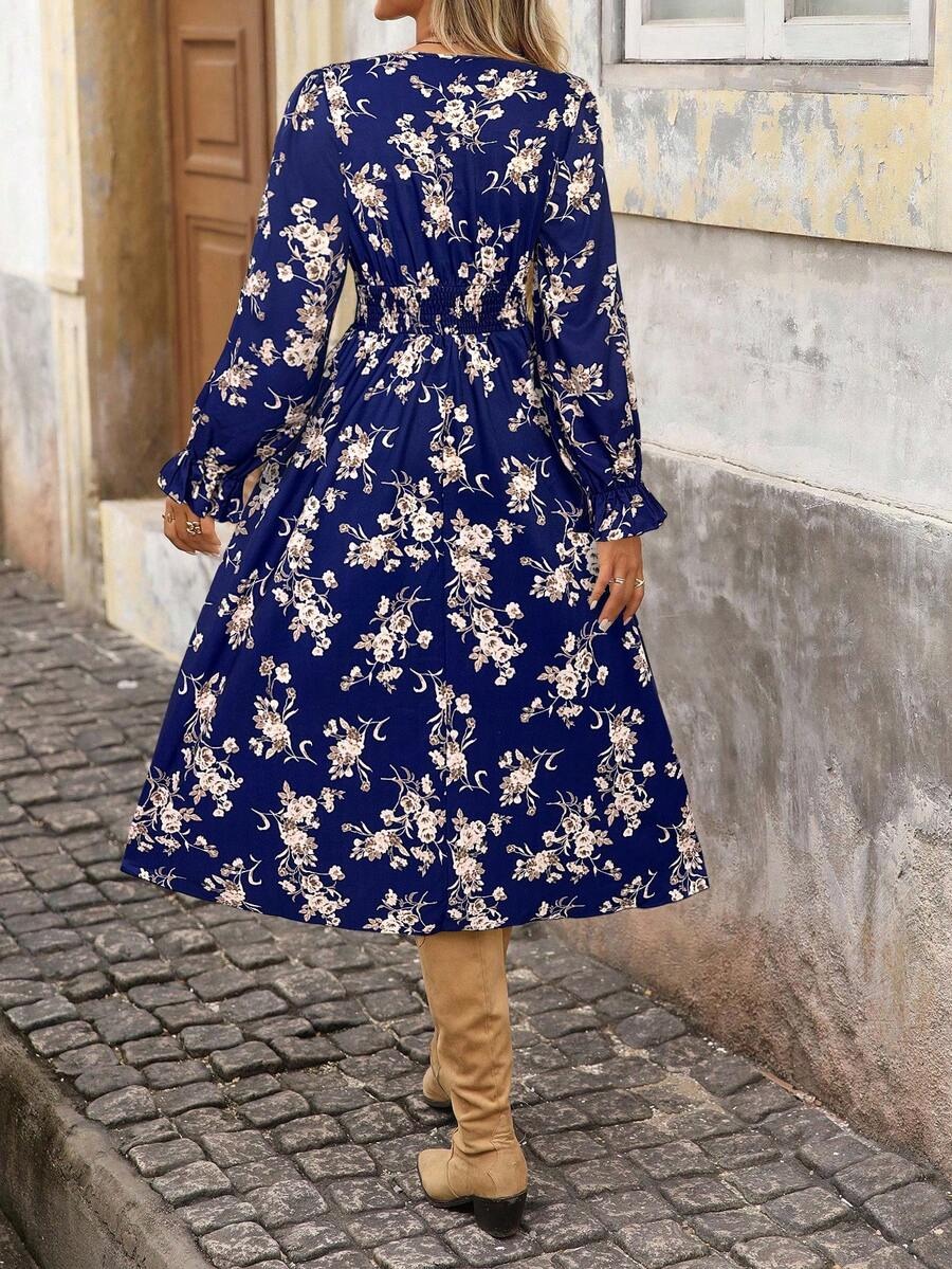 Rochie Midi Lora Bleumarin cu Print Floral Roz