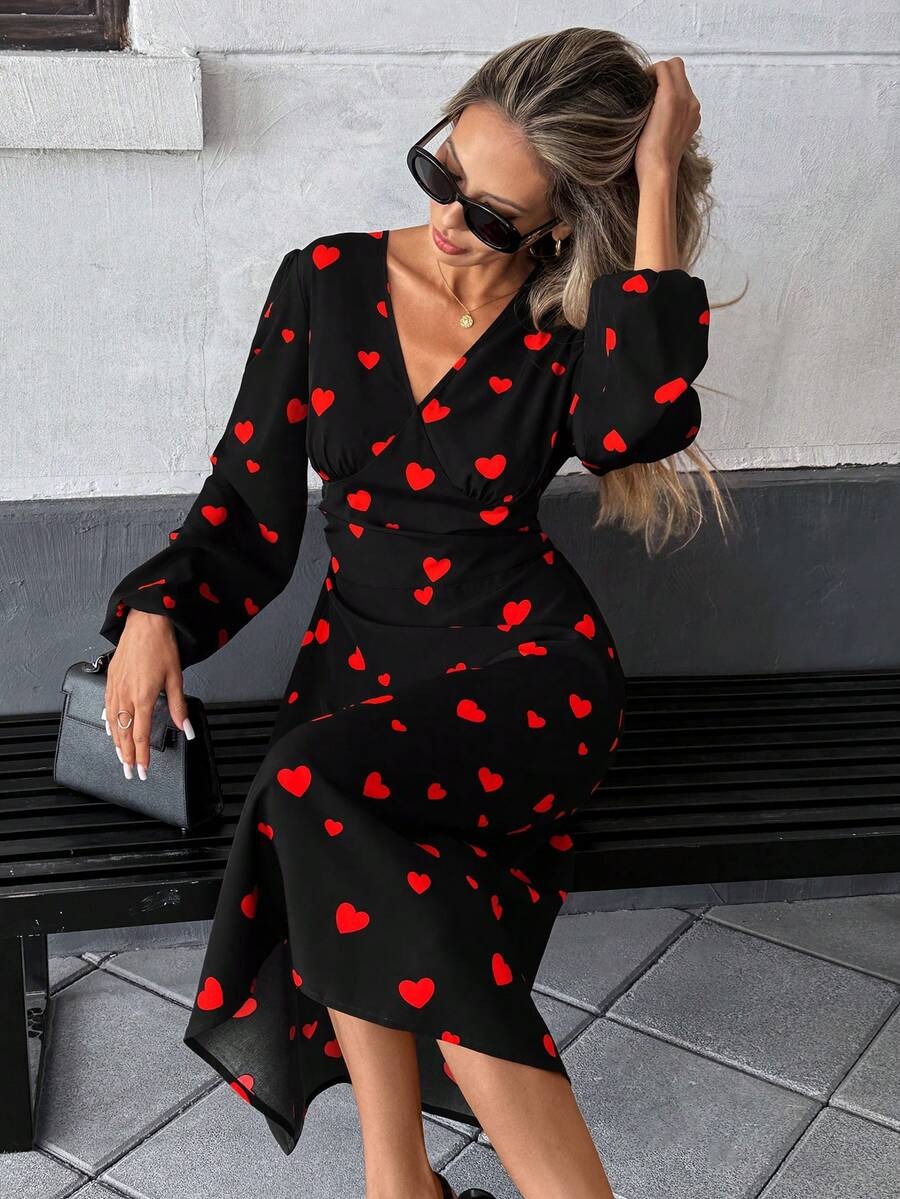 Rochie Midi Dalia Neagra cu Inimioare Rosii