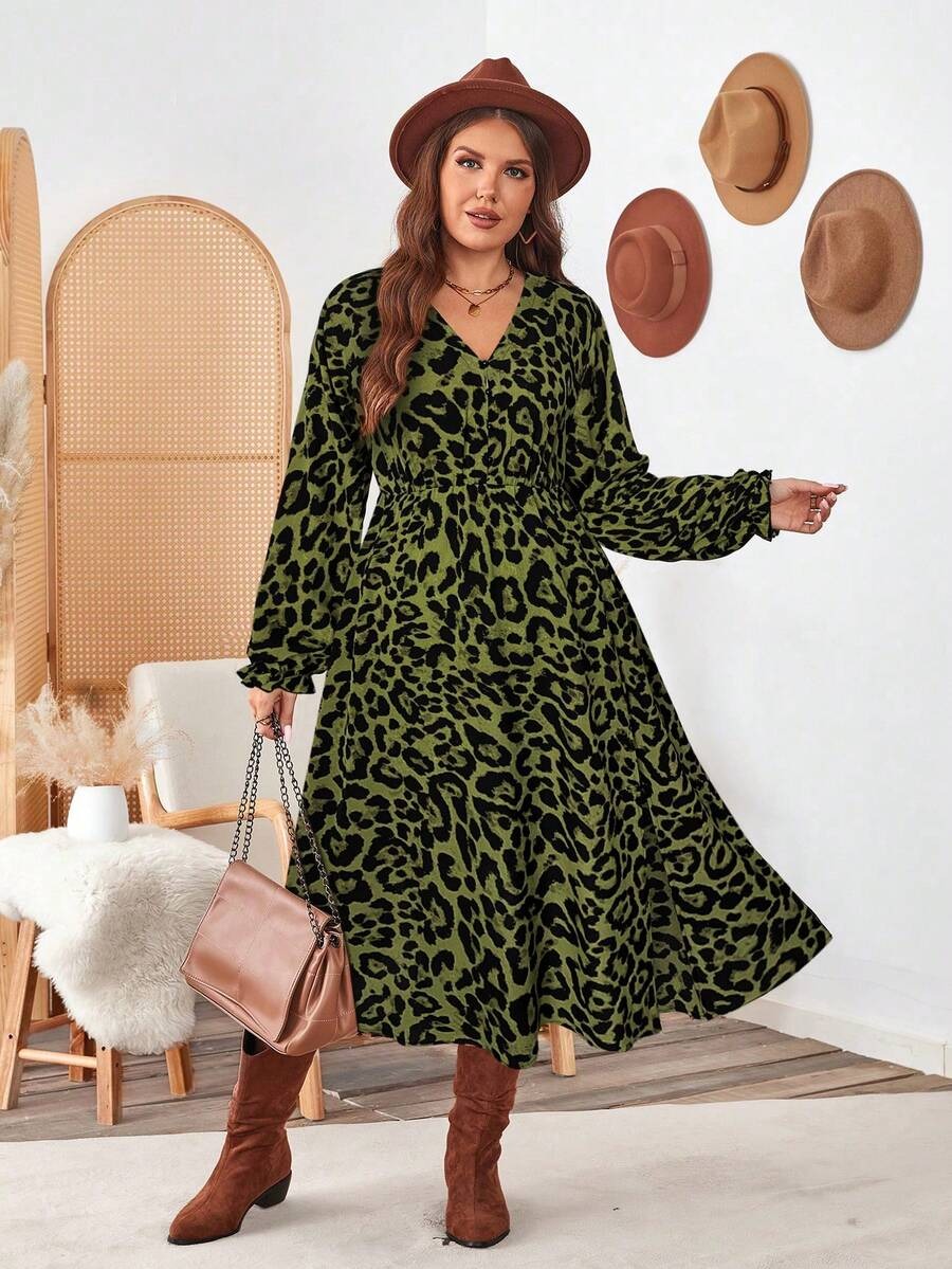 Rochie Midi Daria Verde cu Print Leopard Negru – Marimi Mari
