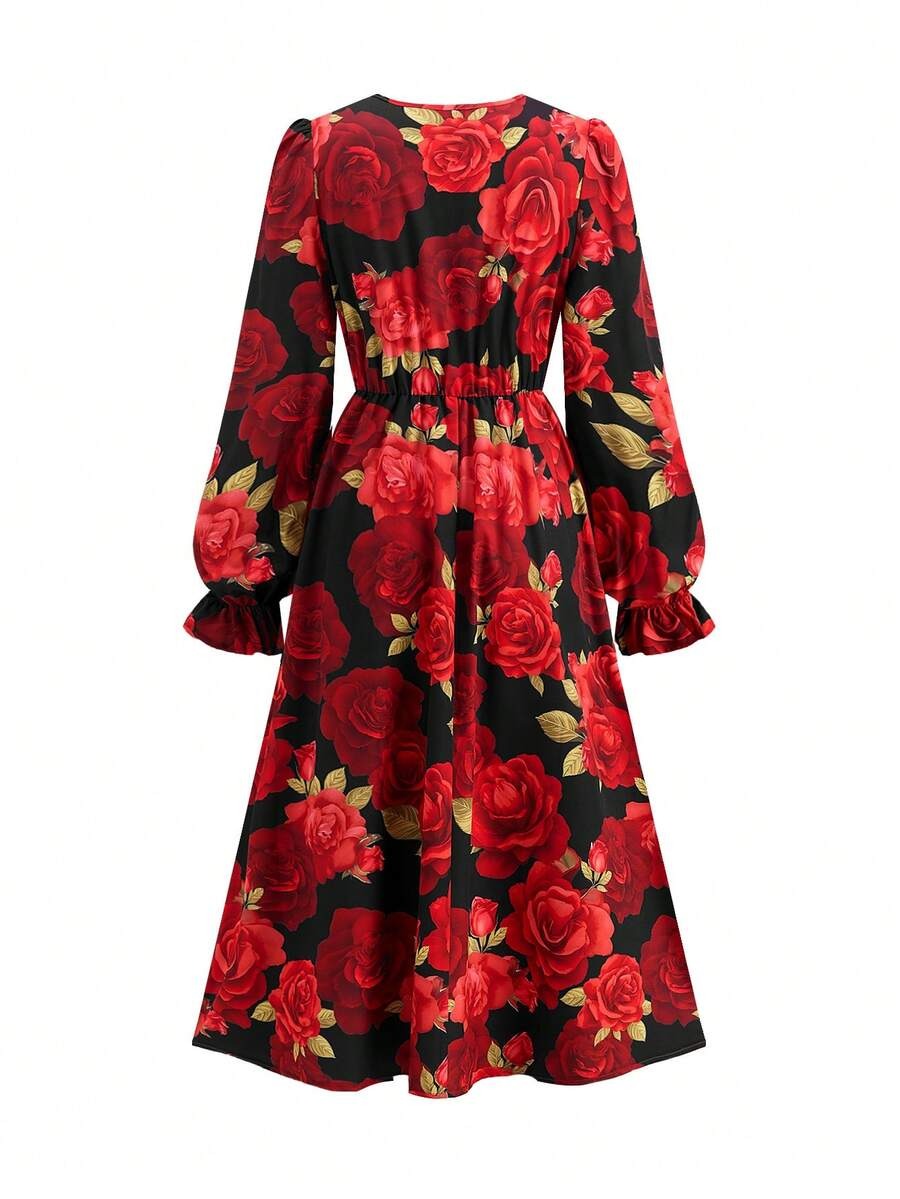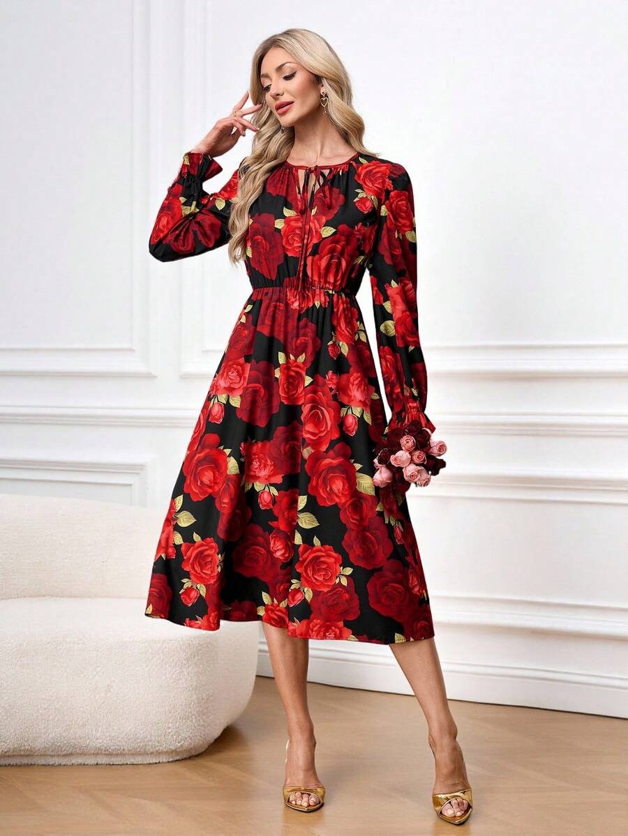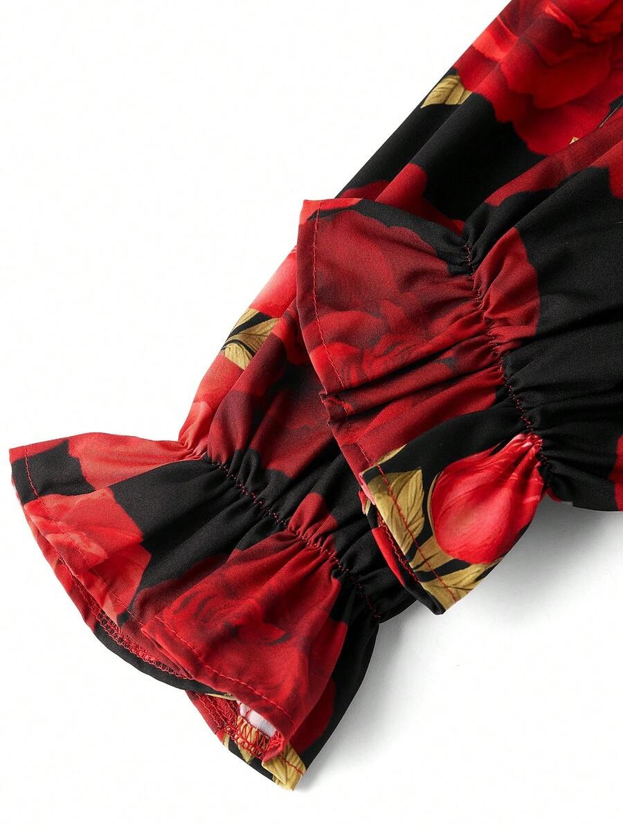 Rochie Midi Demivia Neagra cu Print Floral Rosu