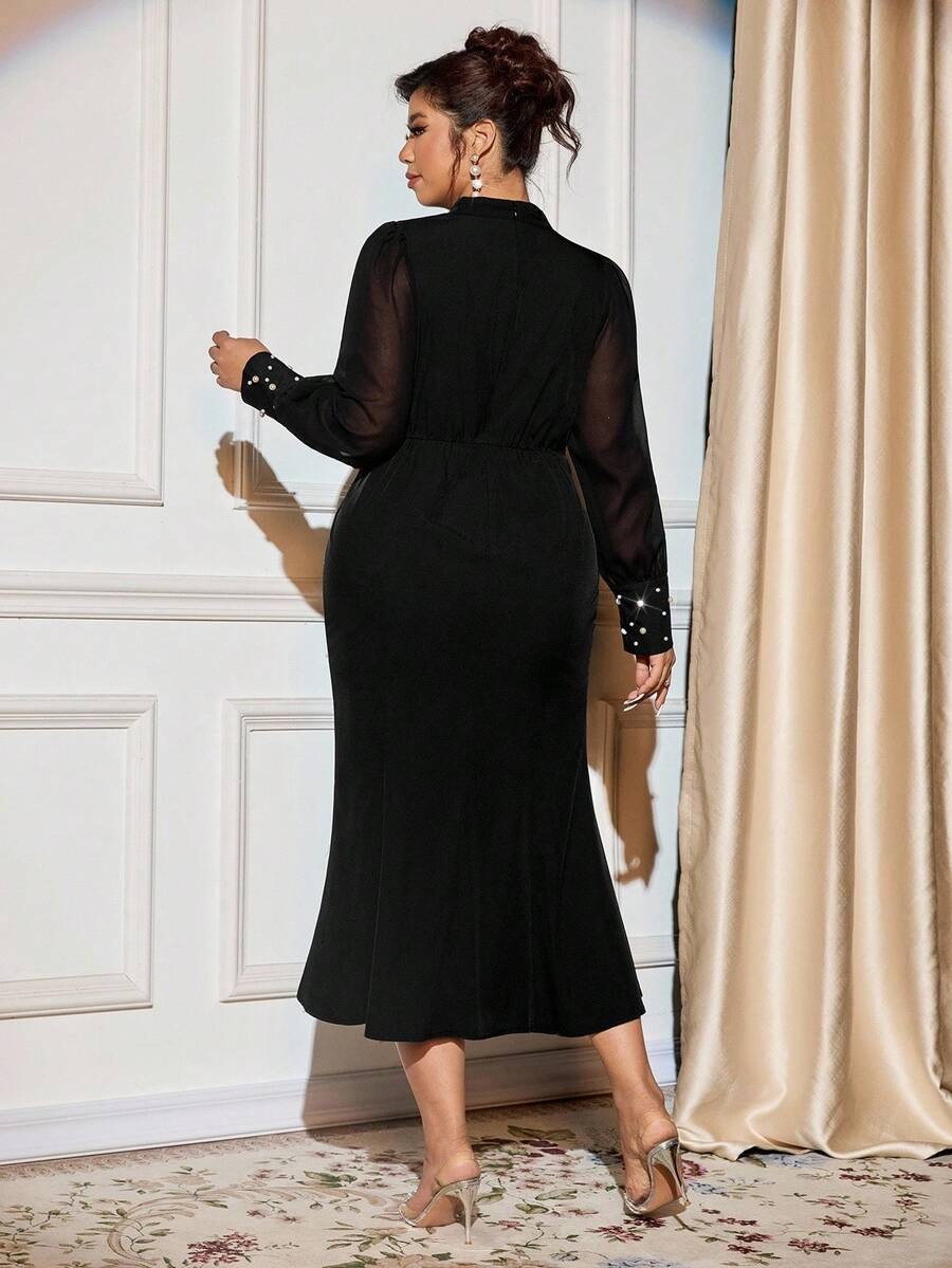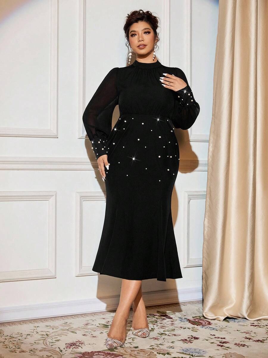 Rochie Midi Elena Neagra cu Perle – Marimi Mari