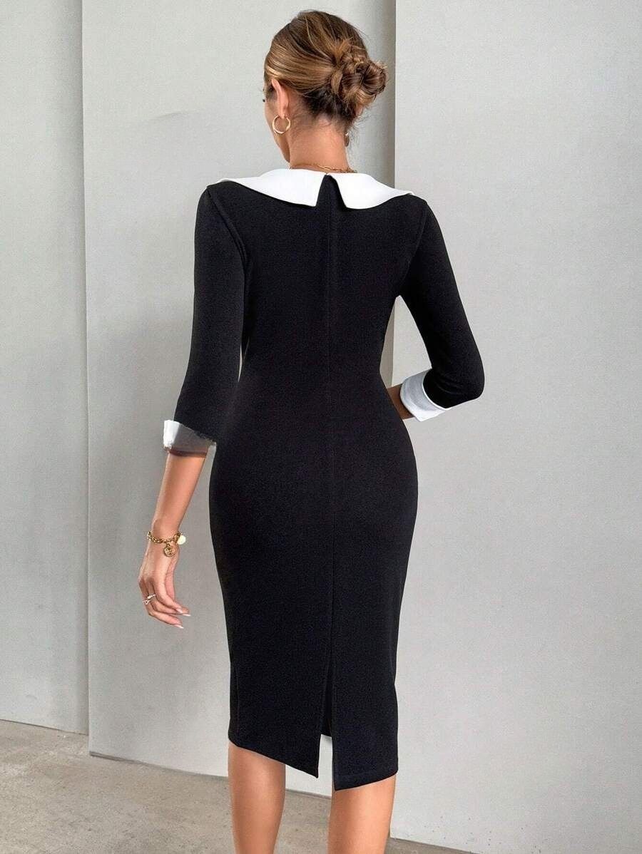 Rochie Midi Elisa Neagra cu Guler Alb