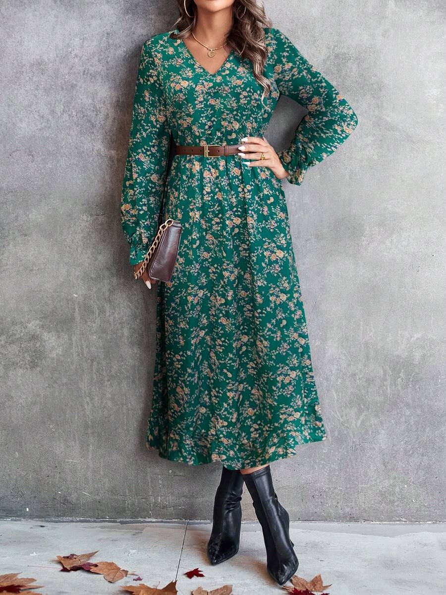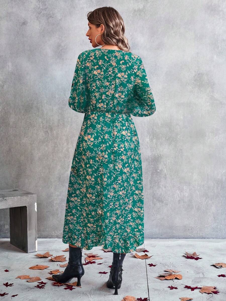 Rochie Midi Elvira Verde cu Print Floral Bej