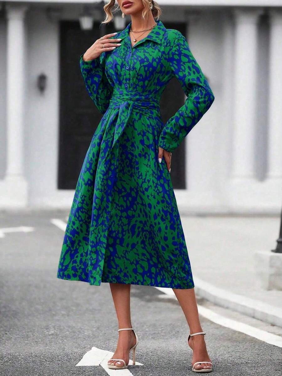 Rochie Midi Ilinca Verde cu Print Albastru – Marimi Mari