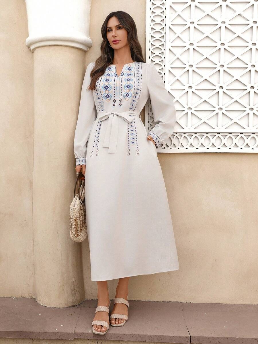 Rochie Midi Kathya Alba cu Print Geometric Albastru