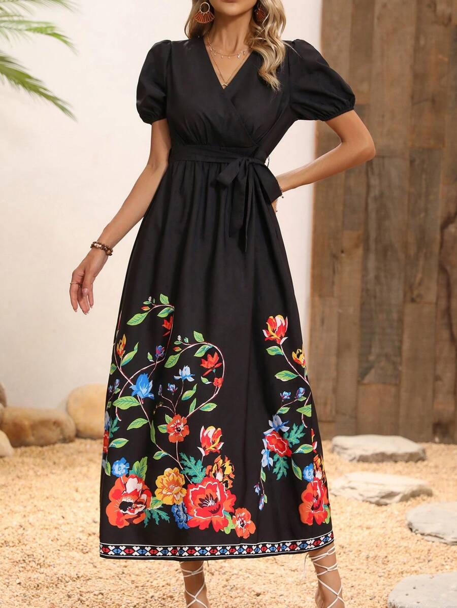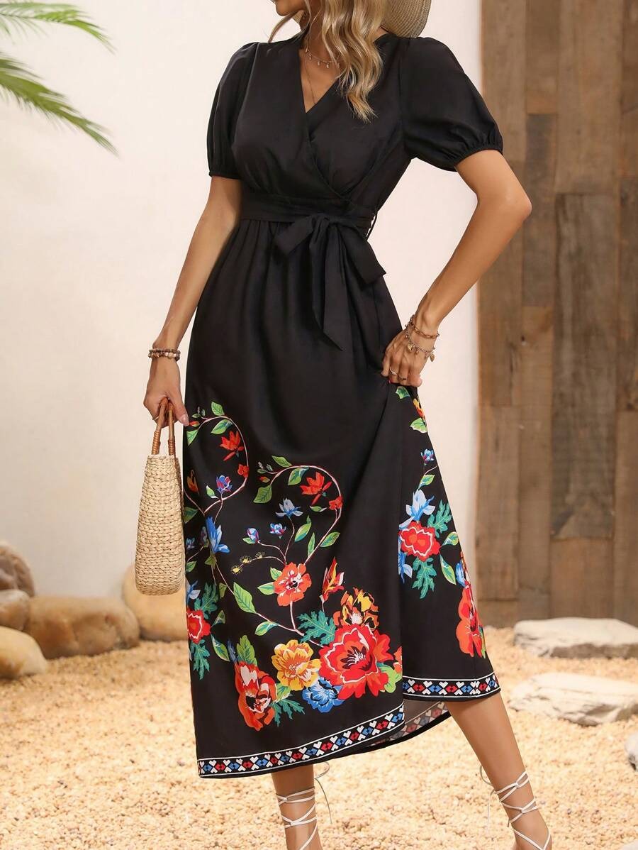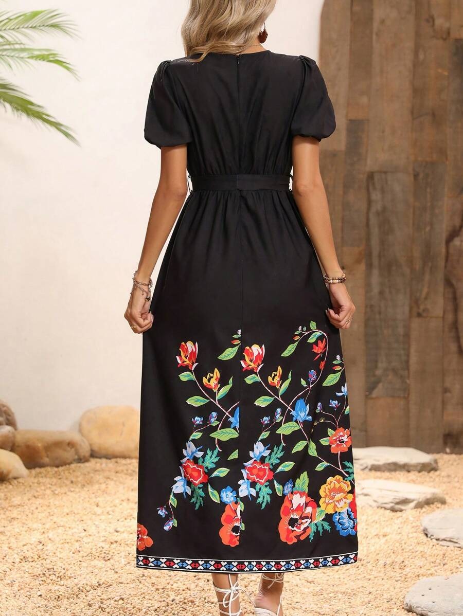Rochie Midi Kaylee Neagra cu Print Floral Multicolor