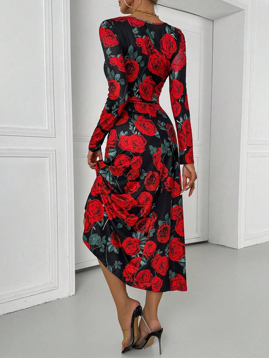Rochie Midi Klara Neagra cu Print Floral Rosu