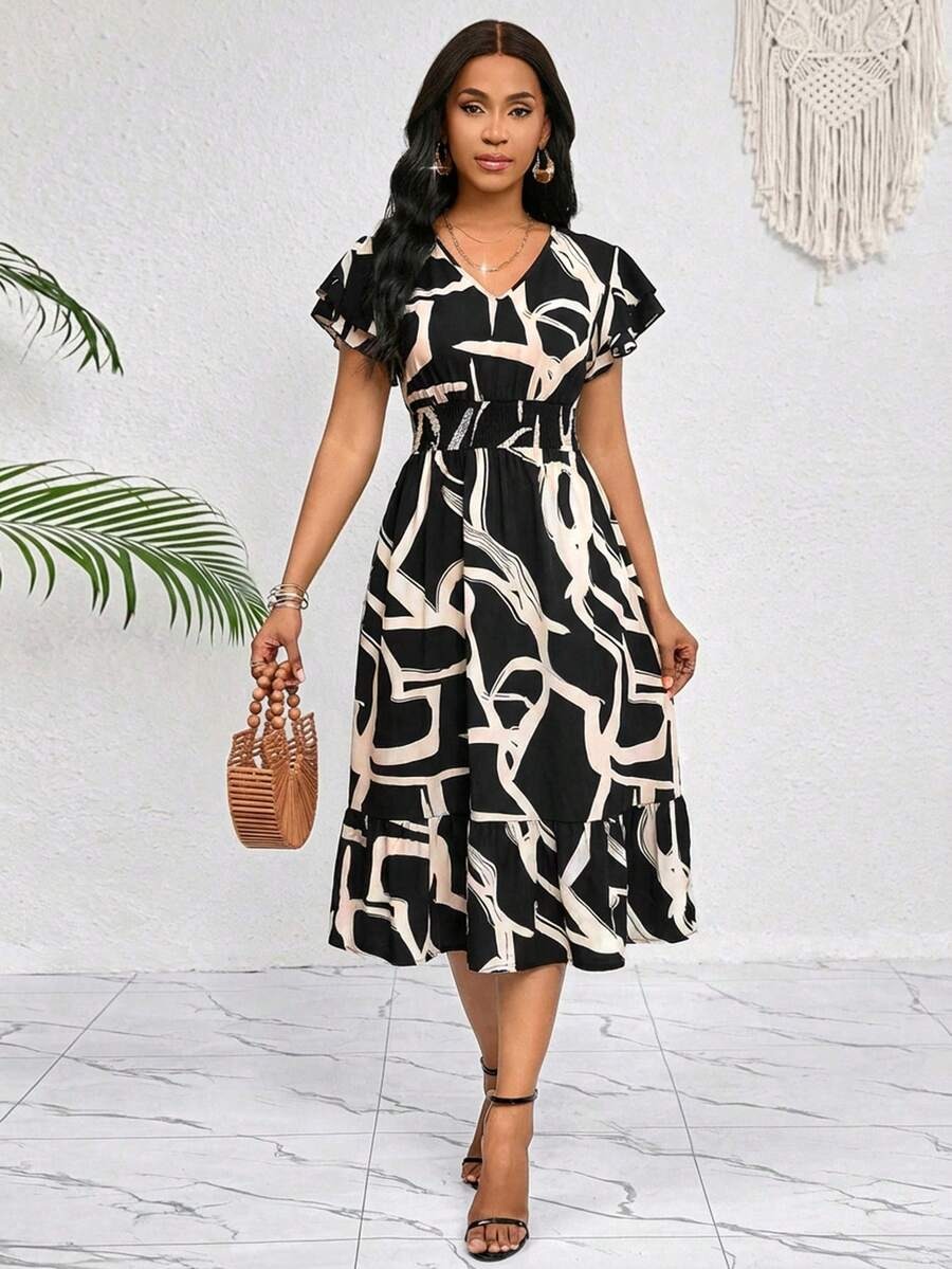 Rochie Midi Paulina Neagra cu Print Crem