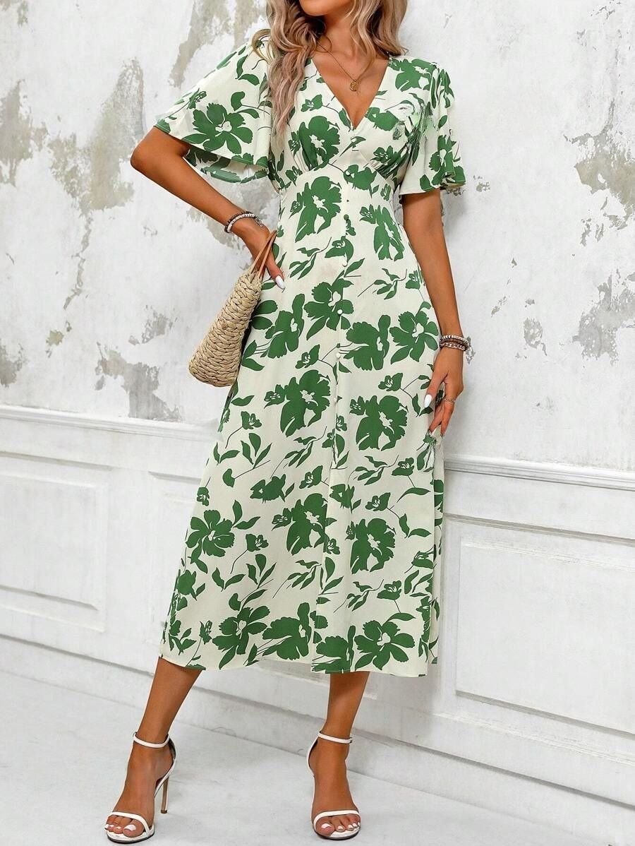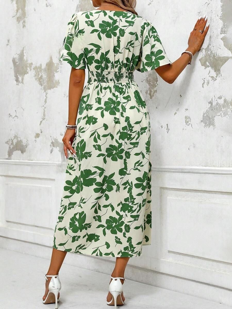 Rochie Midi Pravia Crem cu Print Floral Verde