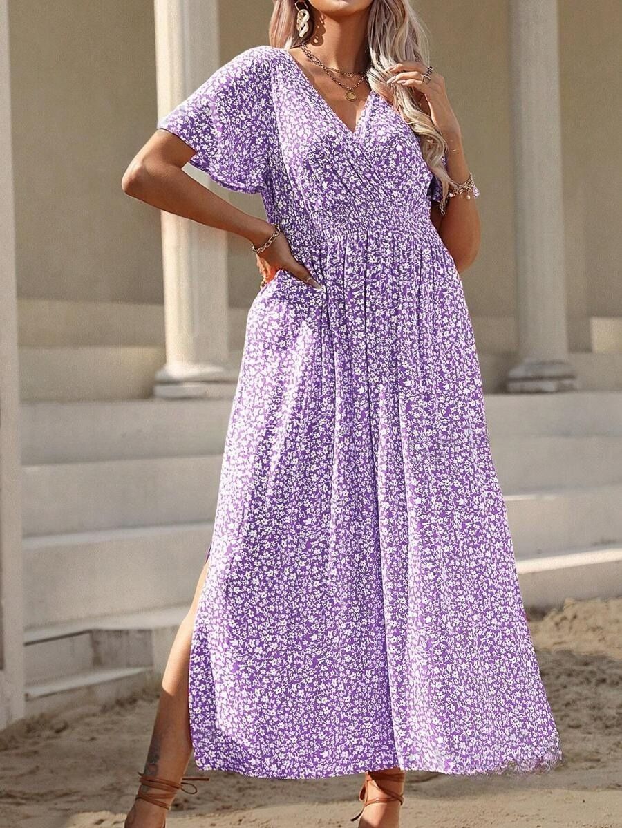 Rochie Midi Ramona Lila cu Print Floral Alb – Marimi Mari