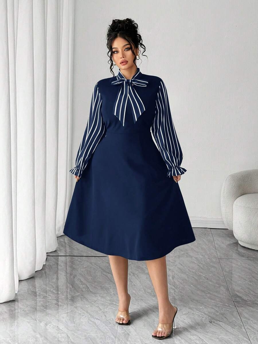 Rochie Midi Renata Bleumarin cu Dungi Albe – Marimi Mari