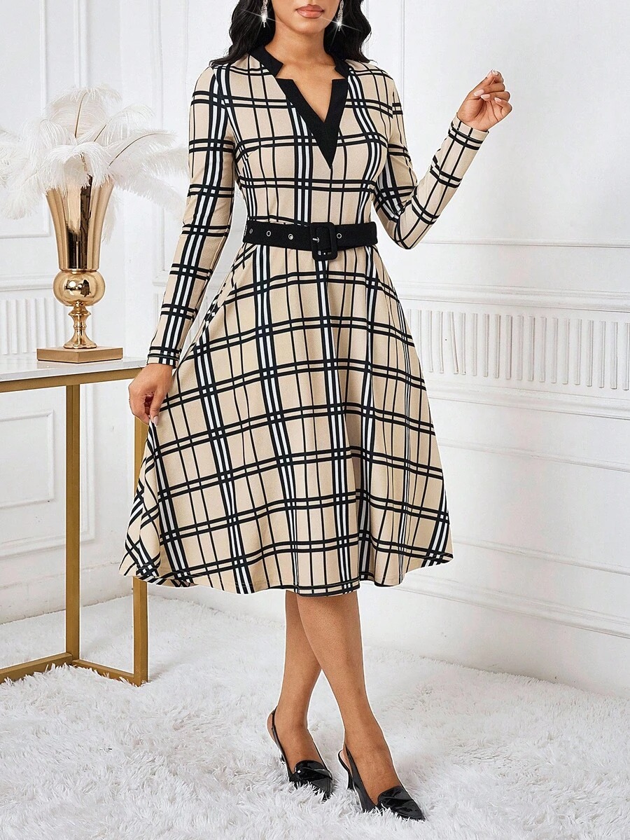 Rochie Midi Ronna Bej cu Print Geometric Negru si Alb