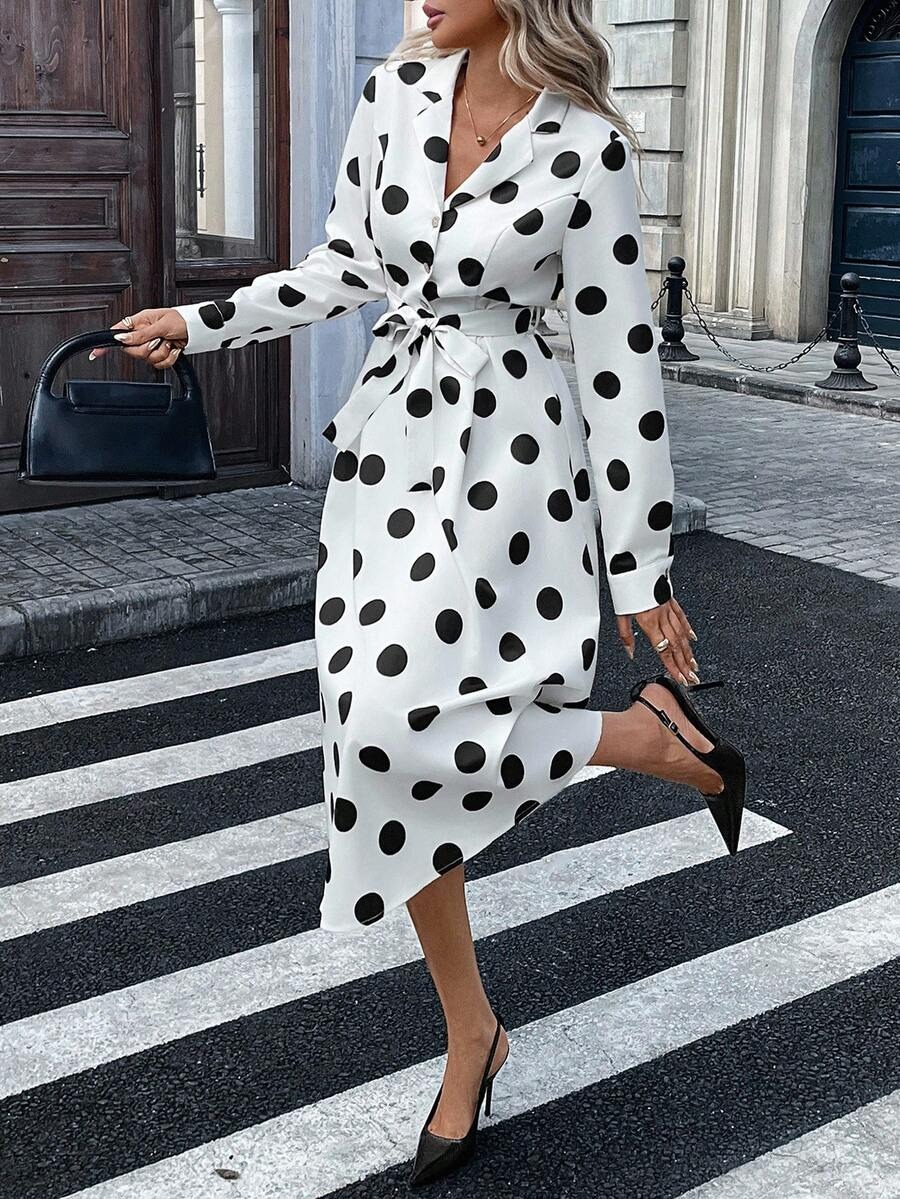 Rochie Midi Sabrina Alba cu Buline Negre