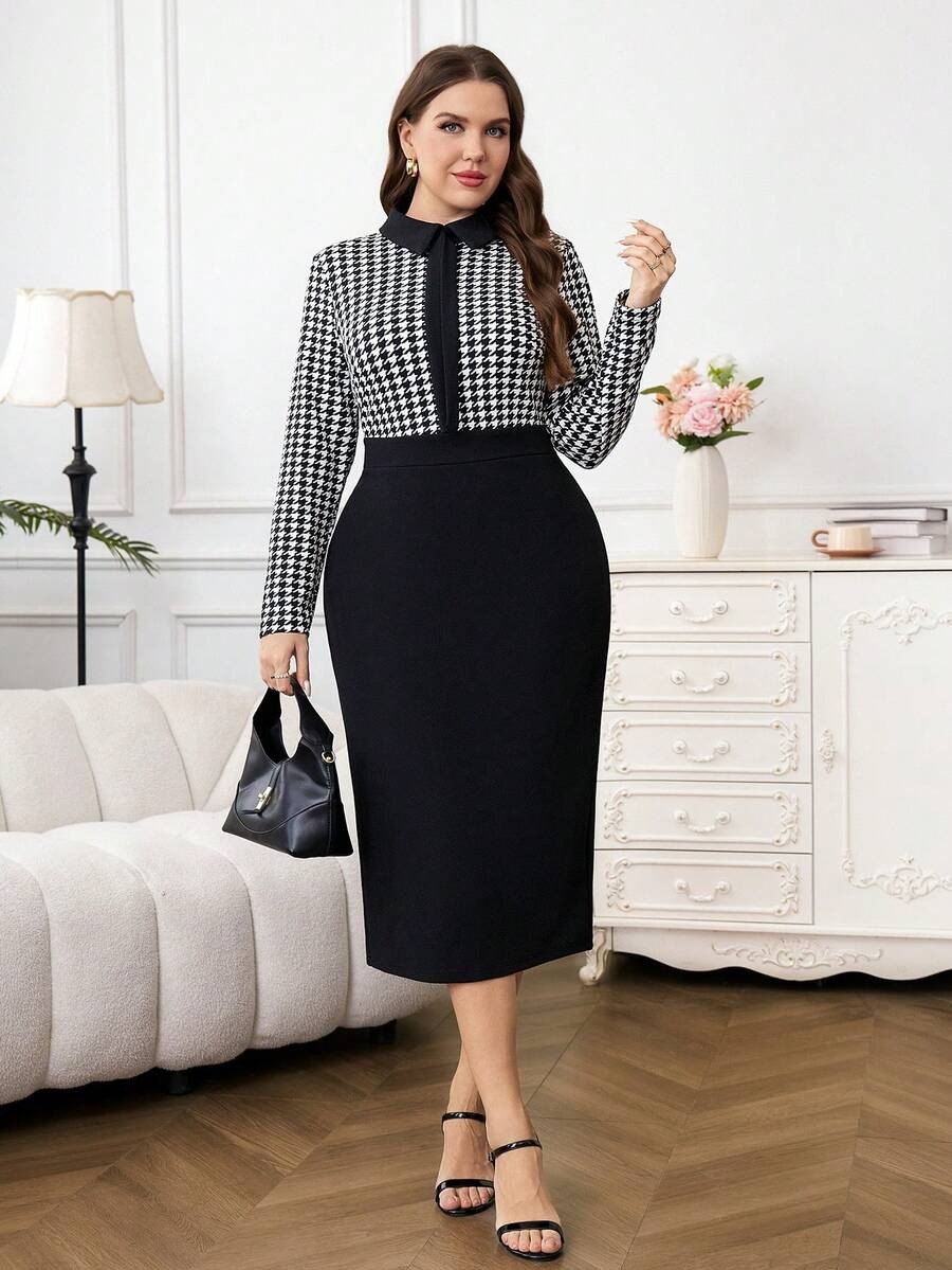 Rochie Midi Surissa Neagra cu Print Geometric Alb – Marimi Mari