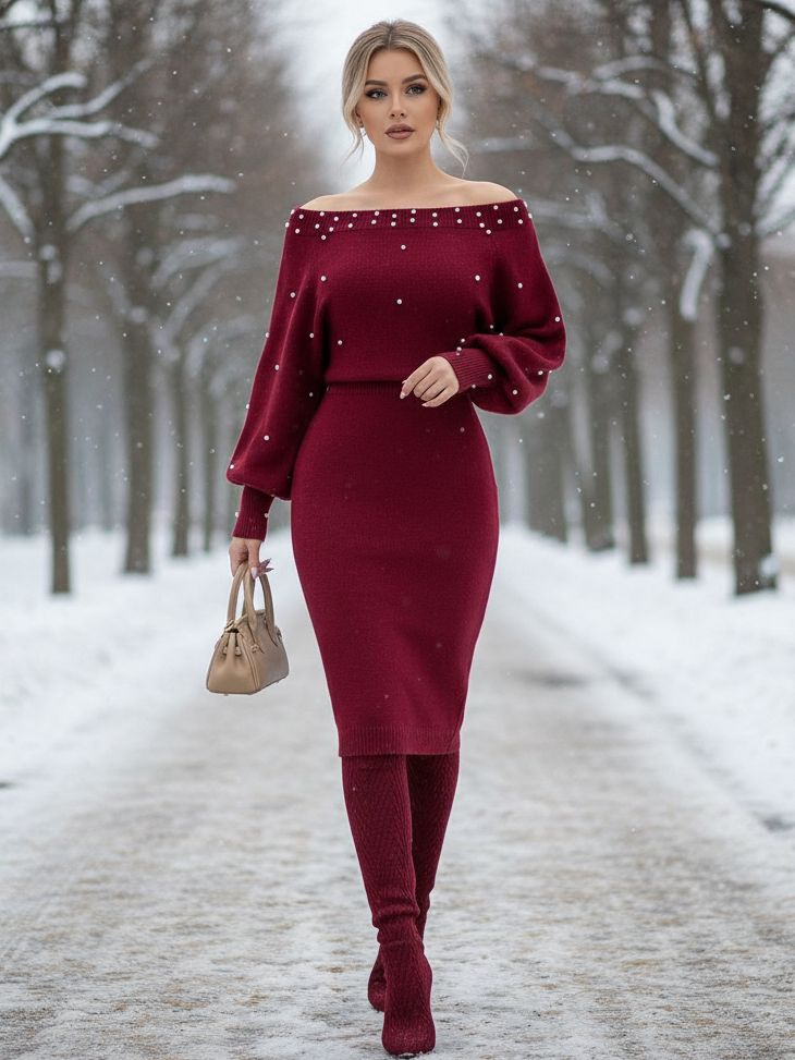 Rochie Midi Tricotata Monalise Grena cu Perle