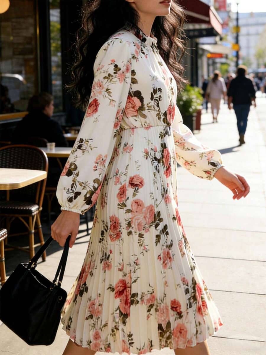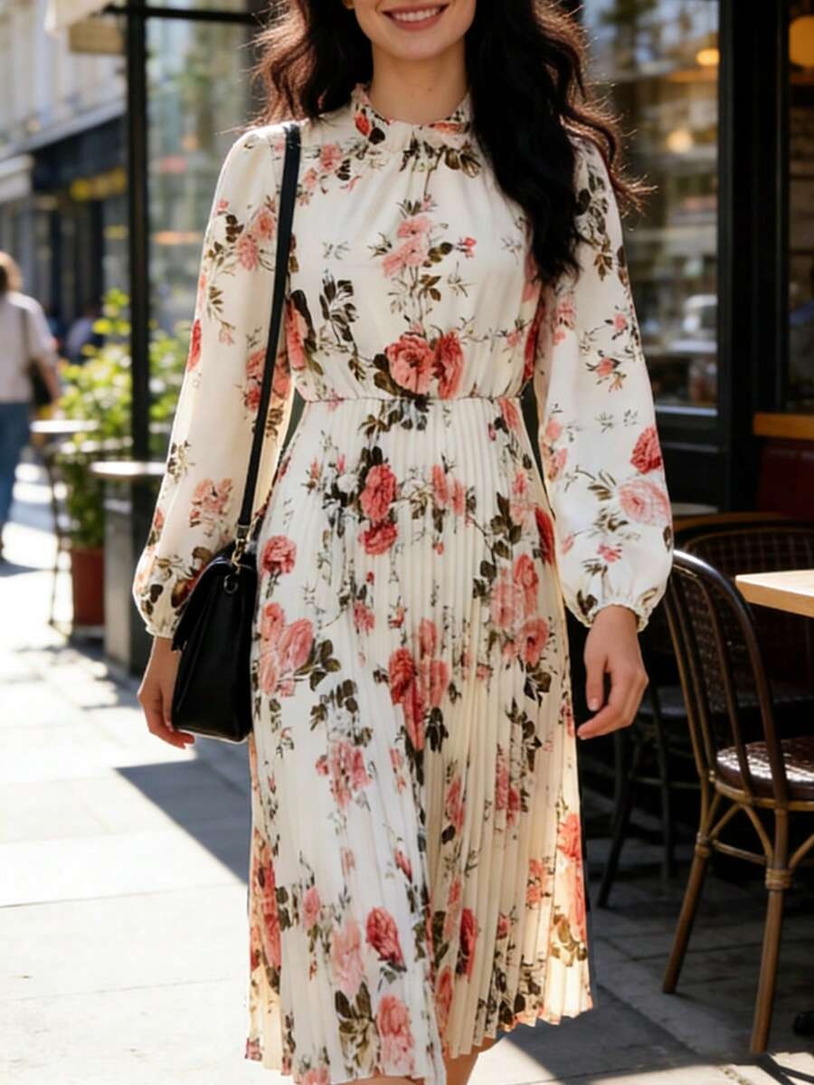 Rochie Midi Yoneta Crem cu Print Floral Roz