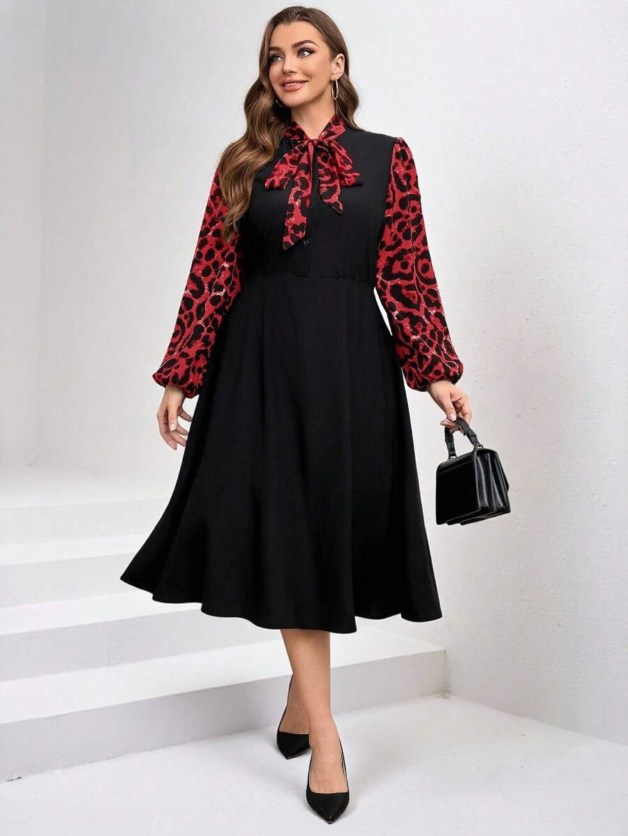 Rochie Midi Zivia Neagra cu Maneci Animal Print – Marimi Mari