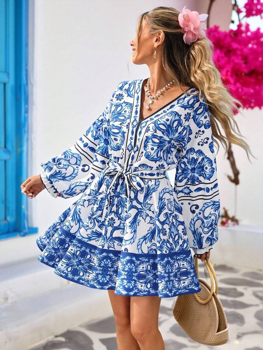 Rochie Scurta Armela Alba cu Print Floral Albastru