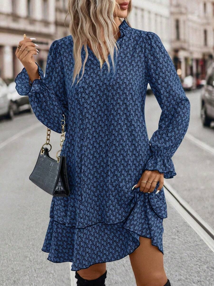 Rochie Scurta Daria Albastra cu Print Geometric Negru