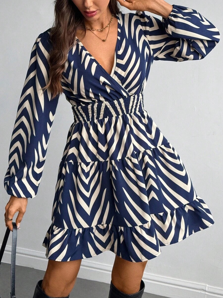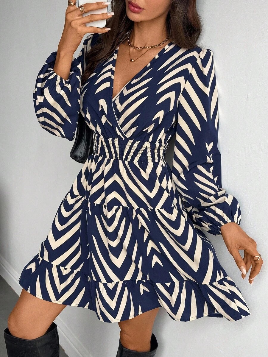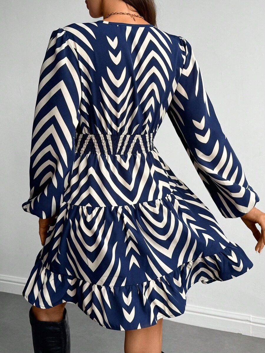 Rochie Scurta Elsa Bleumarin cu Print Geometric Crem
