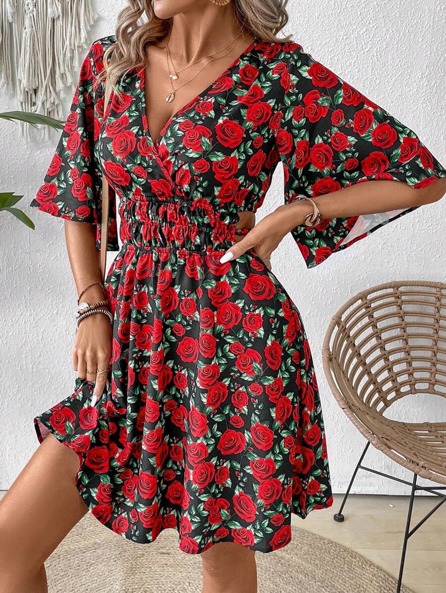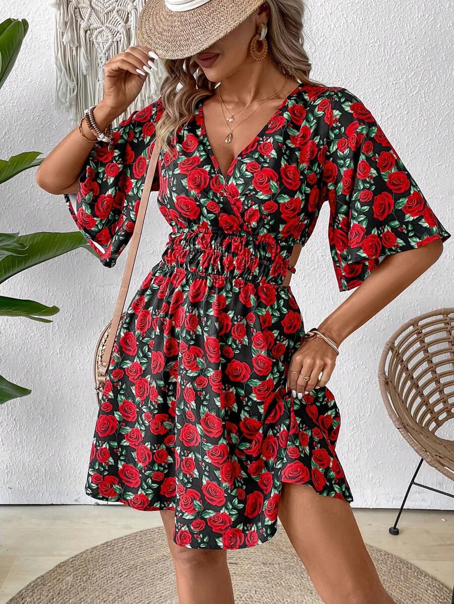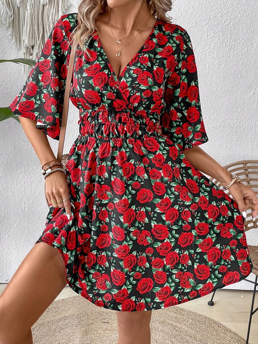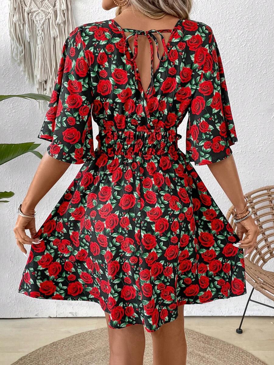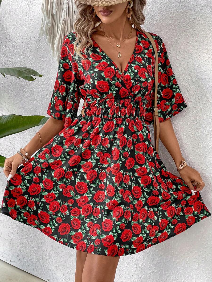 Rochie Scurta Evaine Neagra Cu Model Cu Trandafiri Rosii