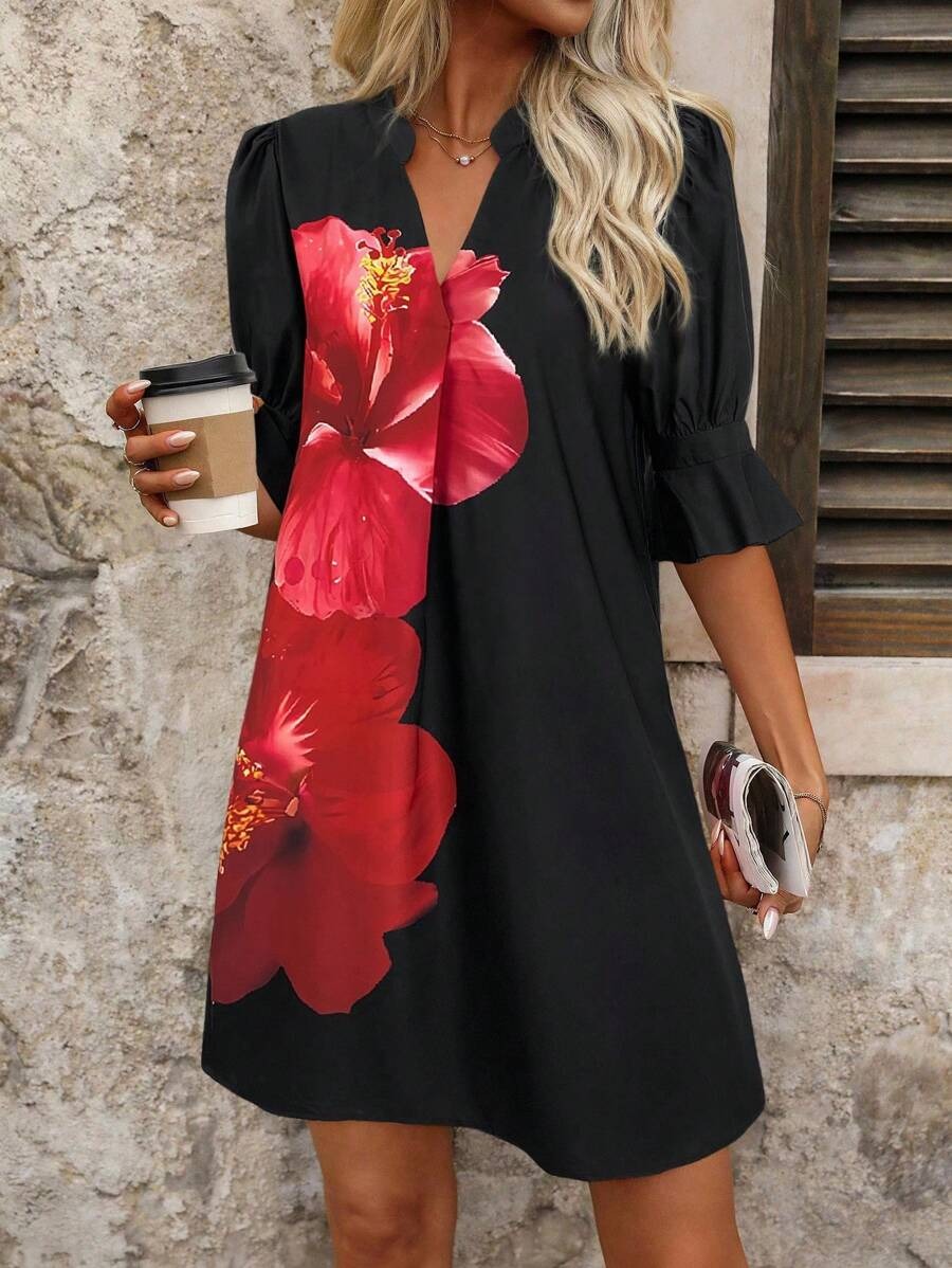 Rochie Scurta Hristina Neagra cu Print Floral Rosu