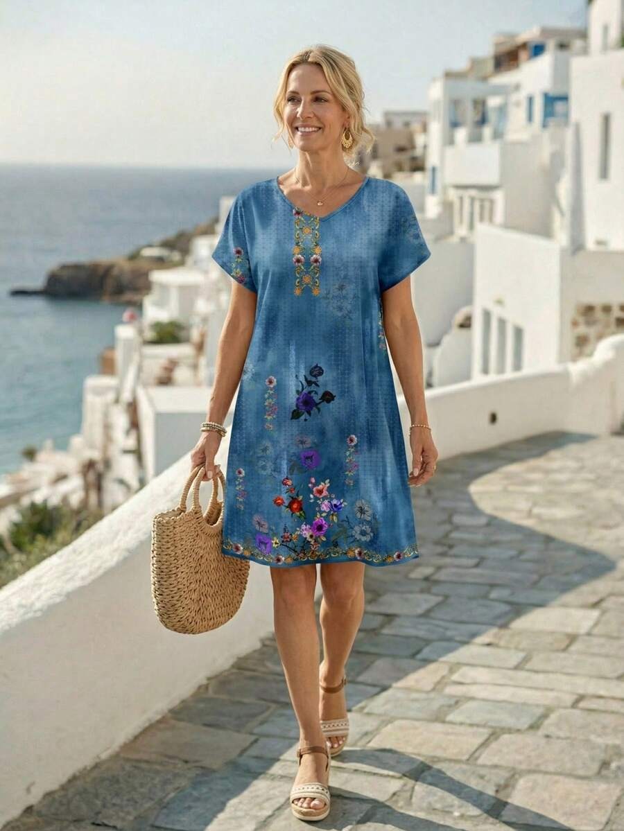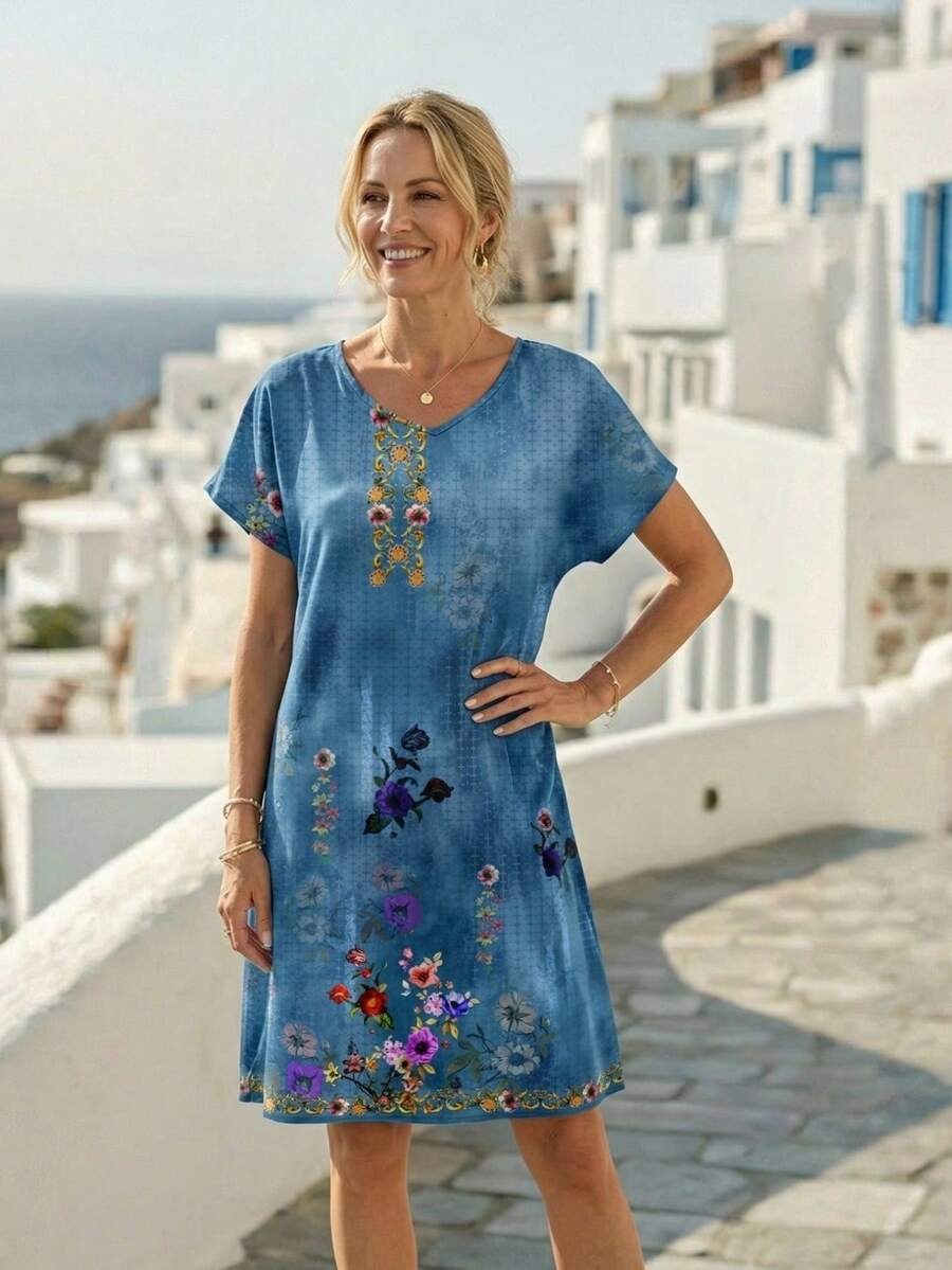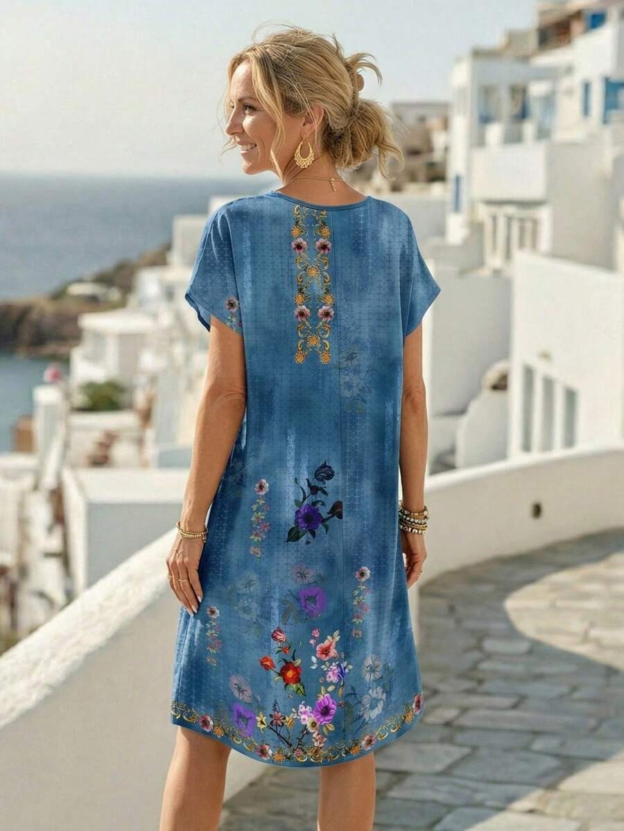 Rochie Scurta Kora Albastra cu Print Multicolor