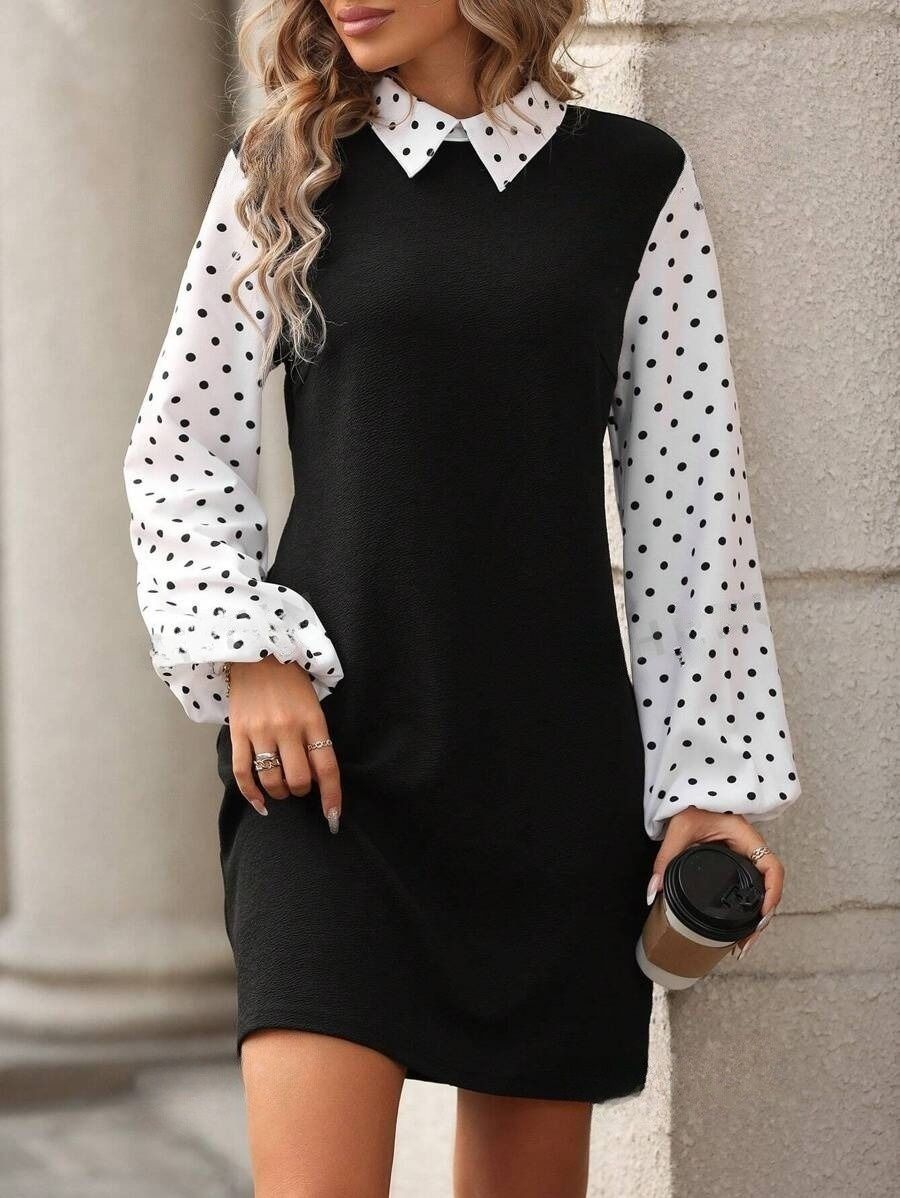 Rochie Scurta Luiza Neagra cu Maneci Albe cu Buline Negre