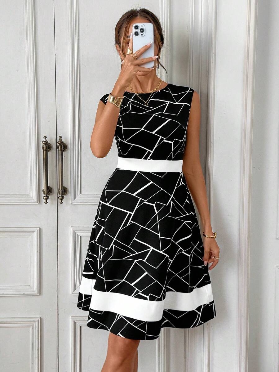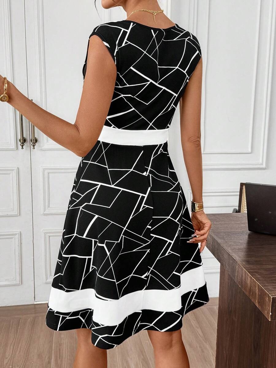 Rochie Scurta Telise Neagra cu Print Geometric Alb