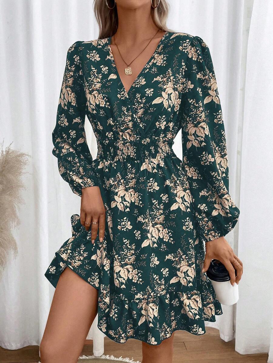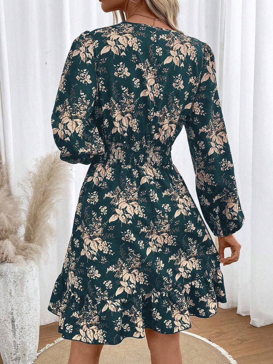 Rochie Scurta Thordis Verde cu Print Floral Bej