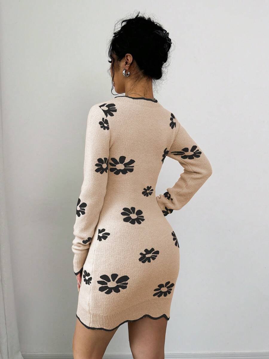 Rochie Scurta Tricotata Elys Bej cu Flori Negre