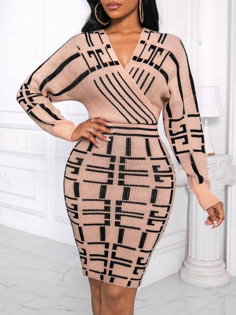 Rochie Scurta Tricotata Natasha Bej cu Print Geometric Negru