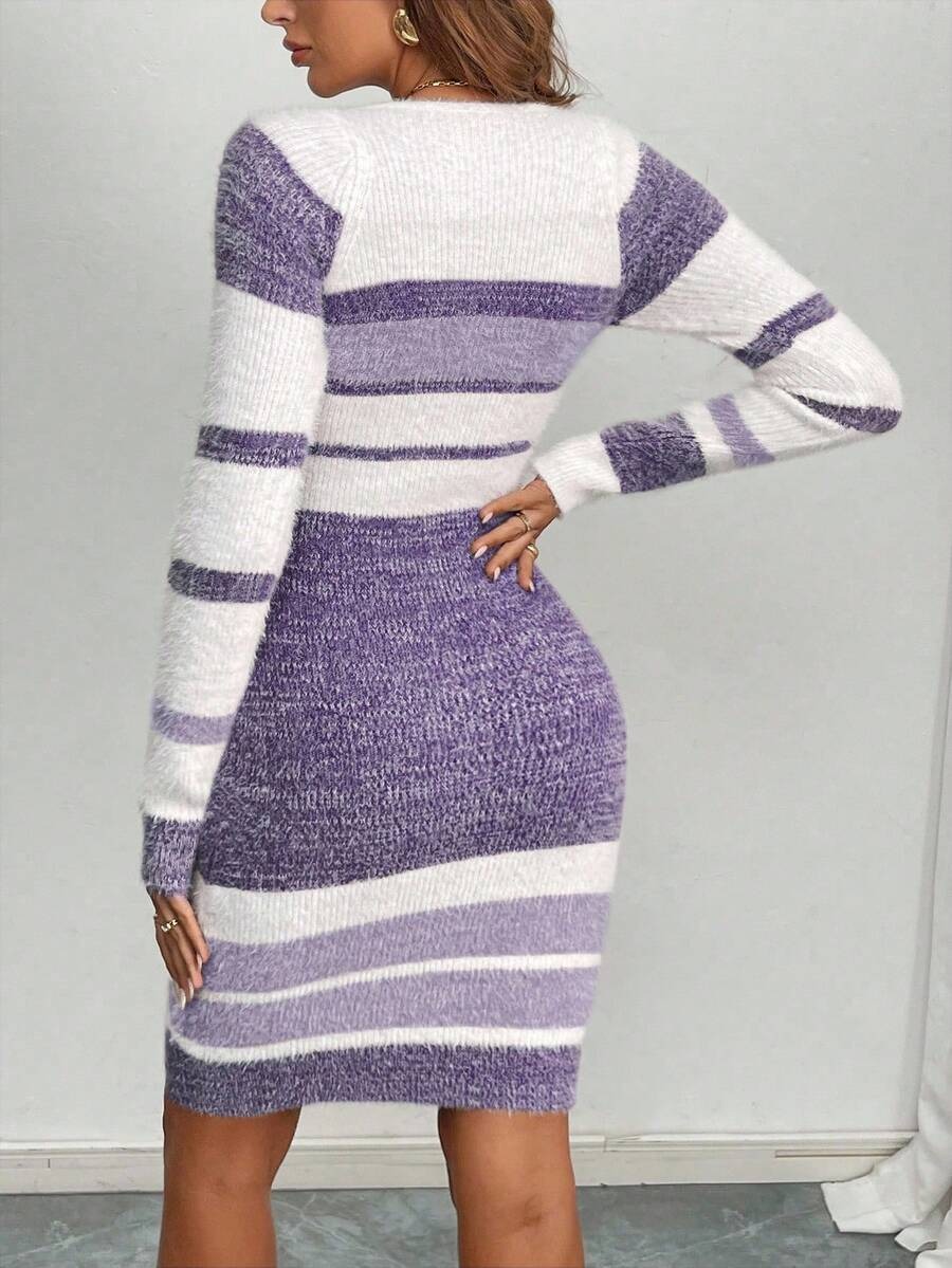 Rochie Scurta Tricotata Sarita Mov cu Dungi Albe