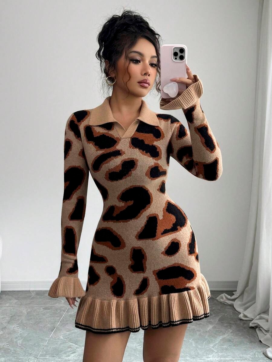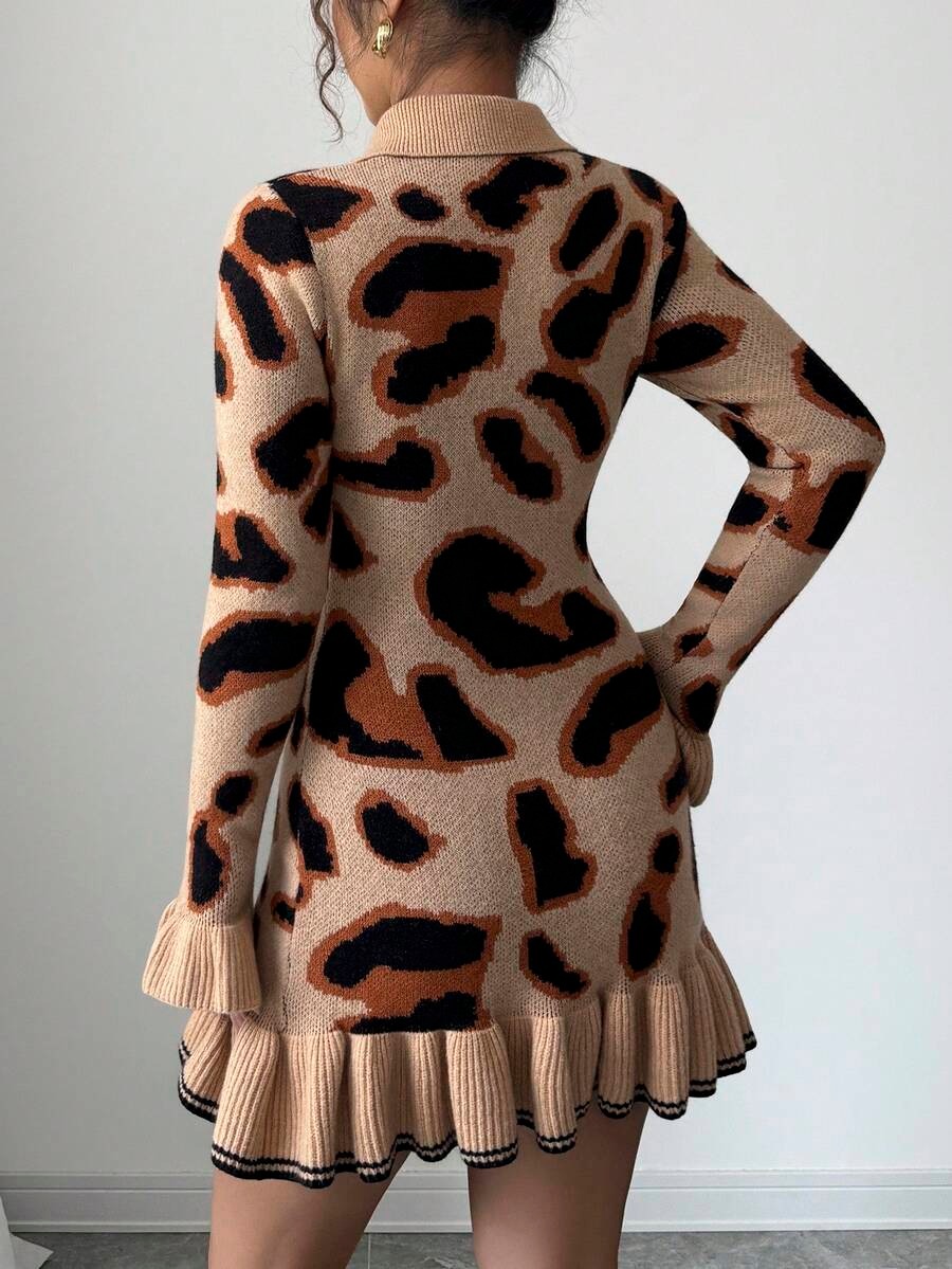 Rochie Scurta Tricotata Valentina Bej cu Animal Print Negru
