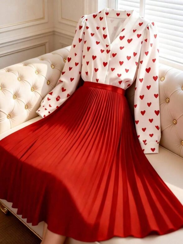 Rochie Midi Suria Alba cu Inimioare Rosii Plisata