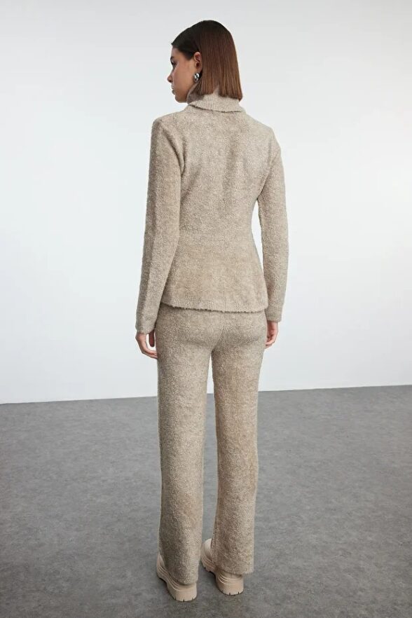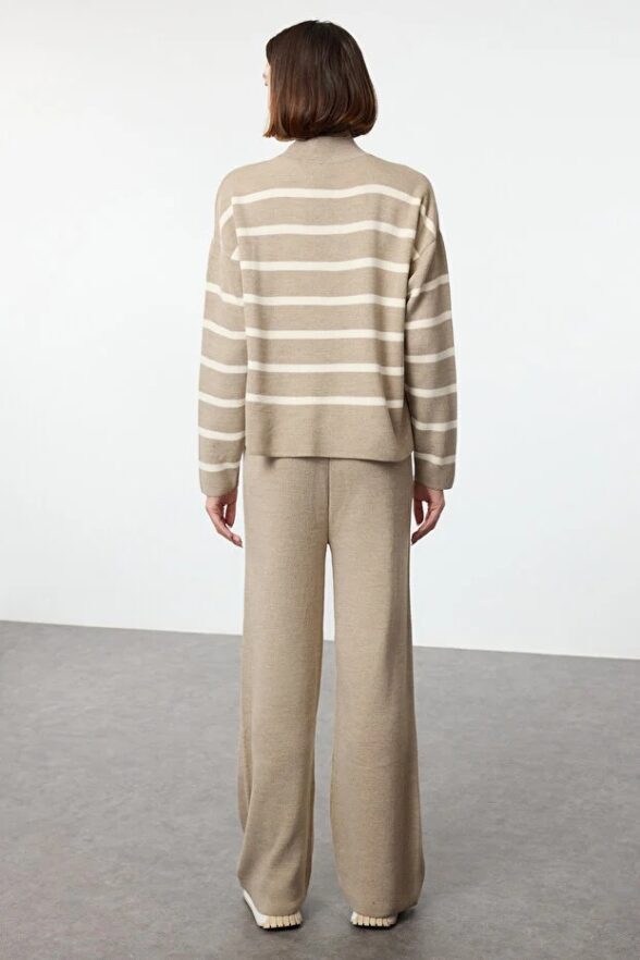 Compleu Tricotat cu Pantalon Minka Bej cu Dungi Albe